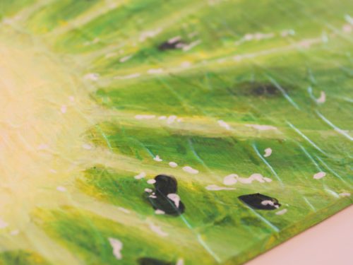 モチーフの質感を出すために、緑や黄、白など、様々な色を重ねられています。