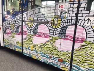 新潟j交通連節バス「ツインくる」の広い車内にも「バスなか美術館」。
