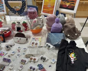 ヒカリのアトリエでは、ご利用者様が日頃丁寧に制作されている世界にたった一つの一点ものの愛すべきアクセサリーやバッグなど、絵画だけではない、グッズ類をたくさんお持ちしました。作品たちを、実際に手に取ってご覧いただいて、身に着けていただいて、ご購入いただける出会いの場でもあります。